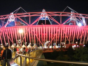 My lone seat has an amazing ariel view from the very back row of what was intended to be press seats, just above the 100 metres’ track. There’s good news and bad news, I don’t like heights but I am under cover if it rains – it doesn’t. With the aid of binoculars I am able to see the other three on the opposite side of the stadium, including watching them looking for me. ‘World record weather’ is announced. Amongst other things we see the women’s shot put F54/55/56 final, the men’s javelin F33/34 final and the Irishman Jason Smythe win the men’s T13 100 metre final. It is a little worrying to note that the javelin area has been situated between the two shot pools. I wonder if they will hit each other. In between jumping up and down (‘as is customary will those who are able please stand’) for medal ceremonies there is plenty of British interest. In the absence of anyone from team GB we are quite happy to forget the history of the past 90 years and pretend that the Irish are still British. Failing that, the Australians will do, indeed almost anyone who isn’t Chinese, who seem to win pretty much everything. And clearly Oscar Pistorius must be British, especially when he breaks the world record in the T44 200 metre heats. As soon as Pistorius has run, people begin to leave and a third of the stadium is empty by 9.30pm. Although this will make leaving the stadium and our journey home easier, I still find it very irritating. Lovely to see the Olympic park illuminated at night and great that Becca and Graeme have been able to enjoy the Olympic experience like the rest of us.