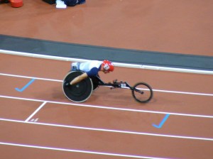 In the over-long gap between our two athletics session we make a trip to Canary Wharf on the DLR so Martha can eat. The only difficulty comes when Chris tries to find his travel card. He does have a travel card, in fact he has several including, one from our 6th August Olympic trip and two for tomorrow, just not today’s. Finally he finds it and we are on our way. Back at the Olympic park we decide to go in to the stadium nearly two hours early so we can sit down. We are back in block E, high above the 100 metres track and finishing line. There is plenty to watch to pass the time. Mistress Efficient is training games makers in synchronised lane marker and block arranging. They also practice retrieving the lane markers quickly so they are not mown down by wheelchairs completing the first lap. Not easily satisfied Mistress Efficient.