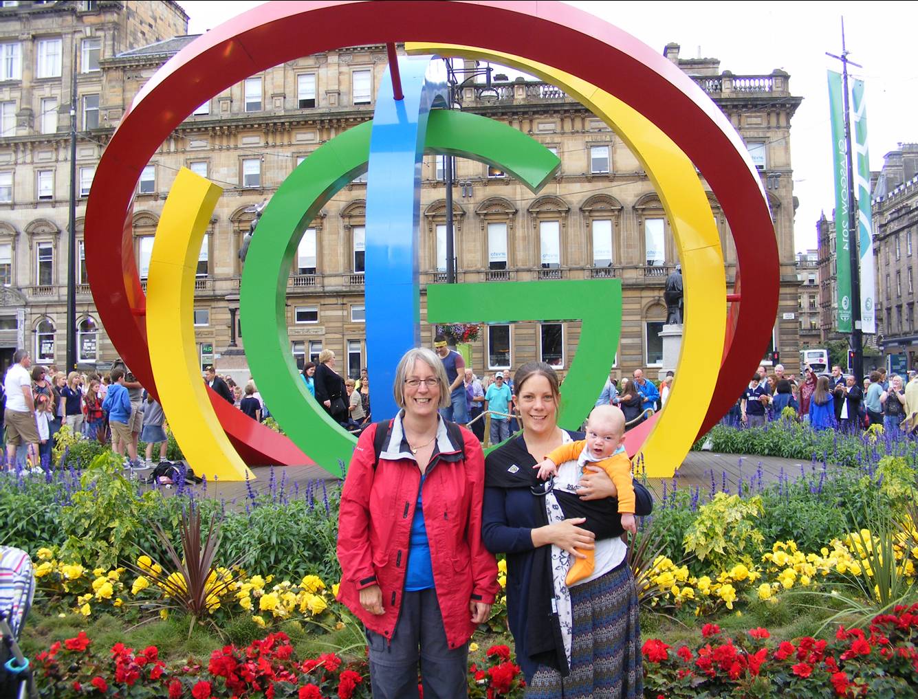 The five of us head for Glasgow on the train from Ayr. Even though I am not in general a fan of cities, Glasgow is looking good. We spend some time on the green but pass up the opportunity of queuing for an hour to have our pictures taken by the Games’ logo. We compromise by queuing not at all and being portrayed by its reverse image. With a bit of judicious photo-shopping I even make it look like we are standing on the right side! Every busker in Scotland is clearly taking the opportunity to benefit from Glasgow’s time in the spotlight. Quality varies; my favourite was the elderly lady in a headscarf with her accordion. We pass various athletes we can’t identify in the streets of Glasgow. Walking through the jewellery quarter our men folk like the look of the £29.50 price tags until they realise it is £2950. There is also a clothes shop with virtually no stock but a window display containing over 1000 old sewing machines. I bet they don’t change their display very often. Unfortunately the reflections from the glass make it difficult to photograph. There are a number of impressive murals on the walls and everyone is very friendly. We follow a ‘Clyde Trail’, seeing how many Games’ mascots we can spot without walking ourselves into the ground, bearing in mind that Martha has Edward to carry.J M & E logo reversed