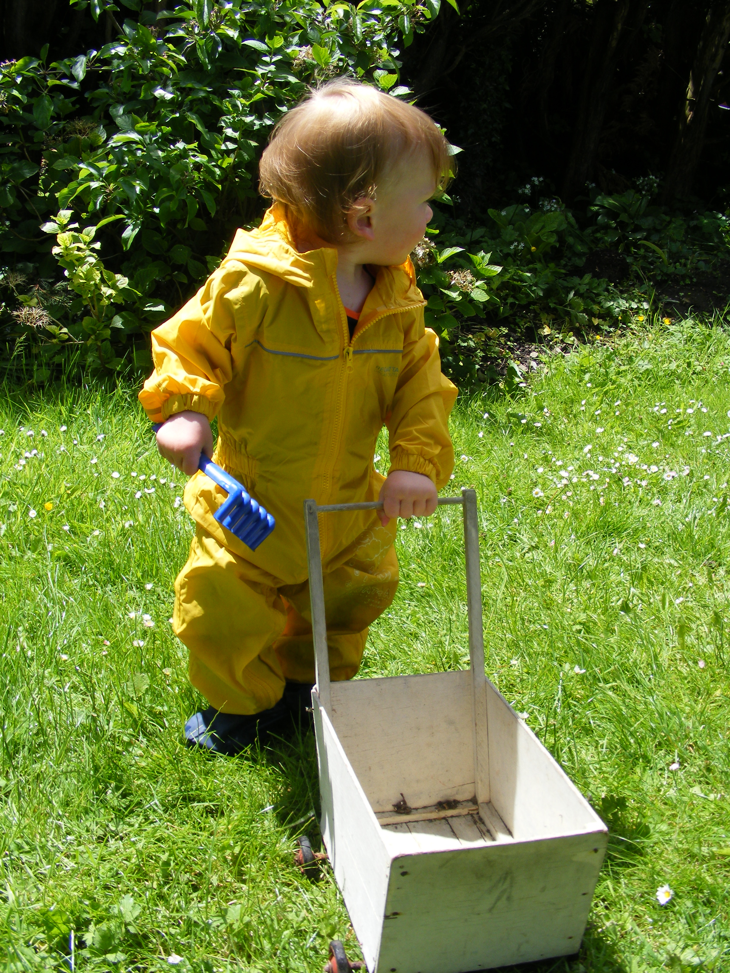 Playing with toys from Previous Generations. Trolley made by great-grandfather, played with by Granny and mum