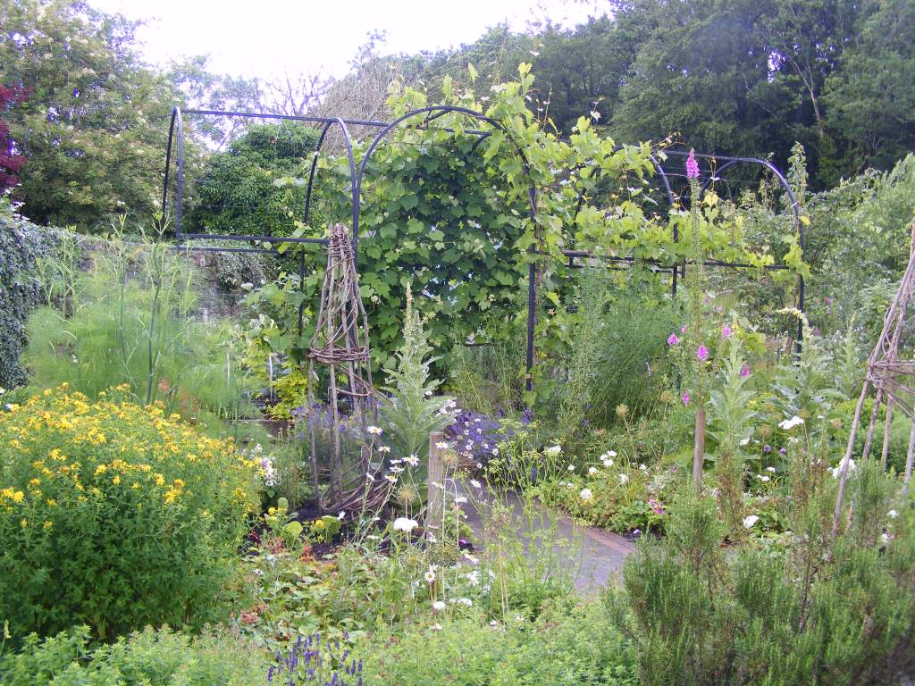 The National Botanical Garden of Wales is on the itinerary today and this is the furthest we plan to go from a site. Today we have our fair share of road re-surfacers again but all the roads that aren’t being re-surfaced are having their verges/hedges cut, so the stop-go board count rises even further. The sat-nav insists that we have reached our destination. We haven’t. We drive round the block a bit in search of helpful brown signs. After a few miles we pick these up and discover that we should have turned left when the sat-nav insisted on us going right. The gardens were definitely worth the drive and the effort. There is plenty to see, including an Eden Project style biome and a bird of prey centre. Inevitably my favourite parts were the less formal apothecary’s garden and the allotments. There is a display associated with medicinal plants and some beautiful quilt panels depicting herbs. I also learn about the physicians of Myddfai, whose story began with Rhiwallon who was the thirteenth century court physician to the Prince of Deheubarth, Rhys Grug. Their tradition continued until 1739 and the Red Book of Hergest, which records their remedies, is held out to be one of the most important Welsh manuscripts from the Medieval period. I couldn’t resist looking for an English translation.