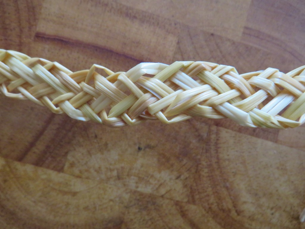 By the third attempt, I was getting quicker but certainly not neater. After an hour and a half I had another ninety inches of plait. I had expected to find working the straw rough to the touch but this wasn’t the case. Keeping the straw wet meant that my fingers were continually damp and having plaited for longer, my right arm and shoulder were aching. By now, visions of plaiting were appearing before my eyes when I closed them.