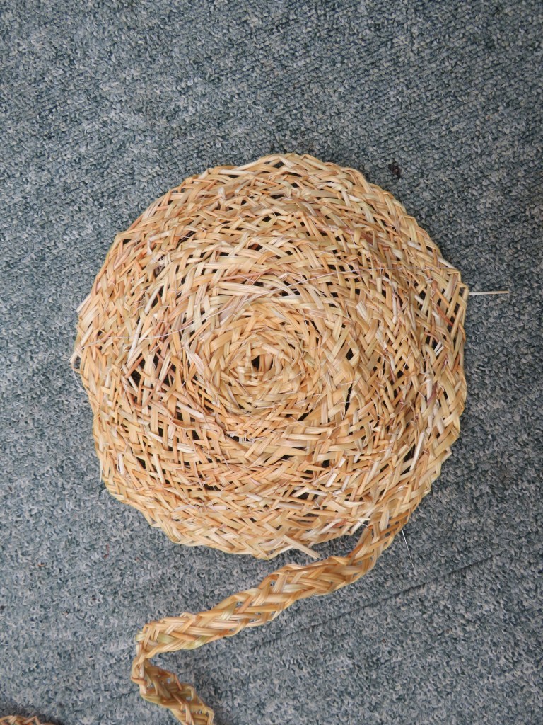 Three more plaiting sessions and I thought I might have enough to make a hat. I started in the centre and began to pull the braid into a spiral, working in an anti-clockwise direction; this may be because I am naturally left-handed. This was a more uncomfortable process, with the rough straw scraping at the skin on the backs of my fingers. It was also difficult to keep the plait damp. I decided not to overlap the braid in the English fashion as that would require more plait. I didn’t really have much idea how to create a hat shape and wondered if I would end up with a flat circle. Professional hat-makers would have used a head-shaped block and steamed the straw into shape. I didn’t have the wherewithal to do this. In the end the shape evolved of its own accord as I continued to sew. I was concerned that it might be difficult to finish off the ends but this was relatively simple as the ends of unplaited straw could be tucked into the weave.
