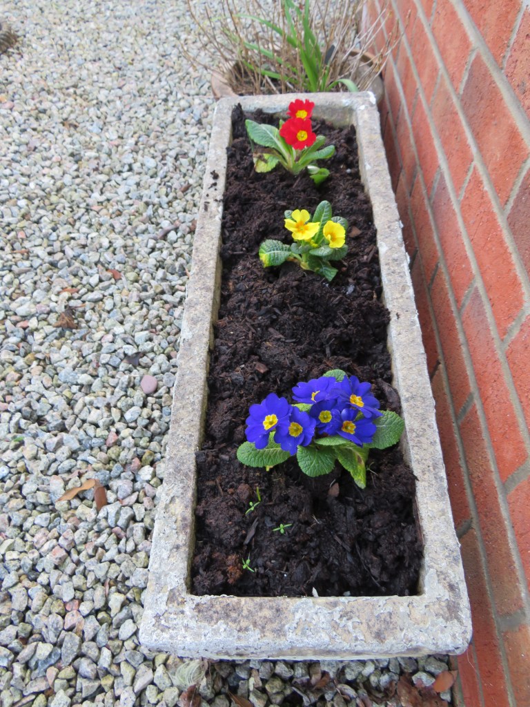 We’ve not been up the garden path for a while because it has been winter and I am not a winter gardener. There have been some minor changes. I’ve planted some bulbs in troughs. I was a bit late doing this and they aren’t showing yet, although others in the garden are coming through. I’ve tried yet again with snowdrops and ended up buying some already in flower. The jury is out on whether they will reappear next year. The bulbless troughs looked a bit bare, so I’ve popped some bright primulas in as well. Otherwise it has mostly been a case of syphoning out the ’pond’ (aka old Belfast sink) when it gets overfull and on a couple of occasions, breaking ice on the bird bath.