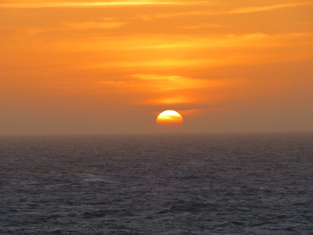 For some reason, I didn’t sleep particularly well but it is lovely to watch the sunrise over the North Sea, at what was either 5.30am or 6.30am, depending whether or not one had already adjusted their watches. We are sailing with the Netherlands on our right, although the coast is too far away to be seen but we spot the occasional oil rig. There is just the slight sensation of movement, so perhaps the predicted ‘lively’ weather is still to come. The phone isn’t working but maybe I need to be on land, so we shall see.