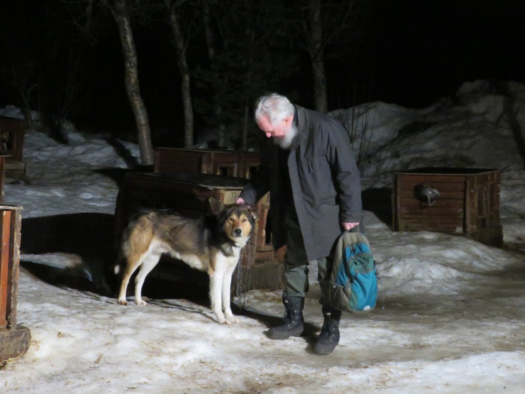 We then move to a lavvu, a traditional Sami tent, where Hannah from New Zealand tells us about the Northern Lights. Ten percent of the Sami population are still nomadic. Following a period of attempted forced integration, Sami culture is now undergoing a revival. Here the beverage is Glogg, a lightly spiced mulled wine. One of the legends associated with the aurora is that it is the rainbow bridge to the afterlife. Then we go out to meet the huskies. Allegedly, people can see the Aurora. This is all a bit king’s new clothes. I can see nothing and neither my phone nor my camera reveals anything either, although some people’s phones are picking up a hazy light. It seems that my phone is too old and it lacks a night mode. I am obviously doing something wrong.